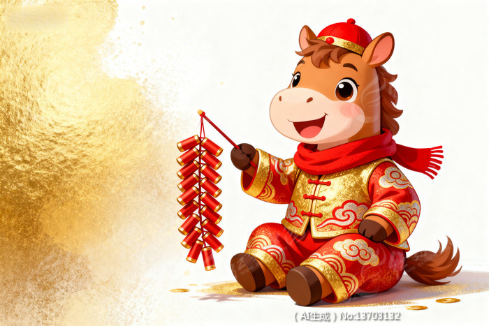 卡通马手持鞭炮着红衣金纹喜庆贺岁