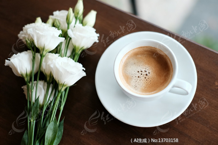 咖啡杯与白色花朵的静物摄影