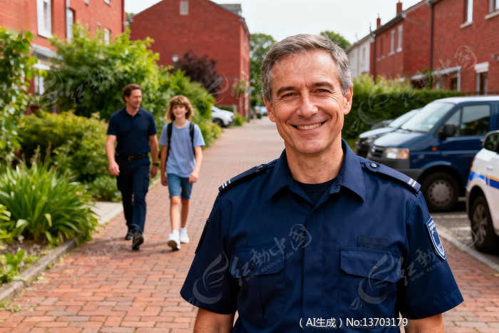 警察微笑站在街道背景有行人和车辆
