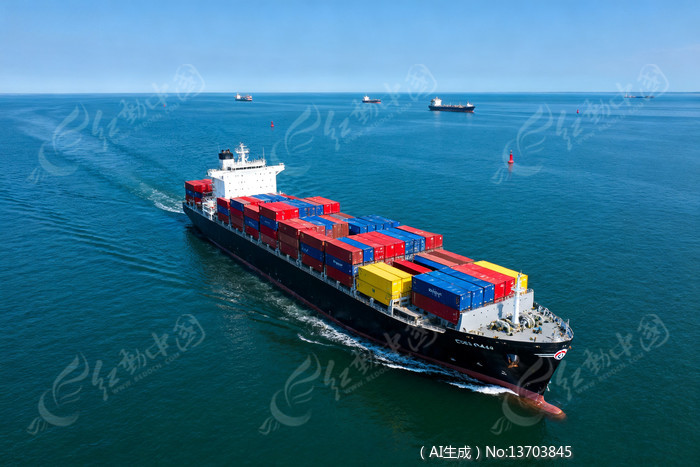 集装箱货轮在蓝色海面航行