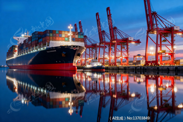 集装箱货轮在港口停泊灯光倒映水面