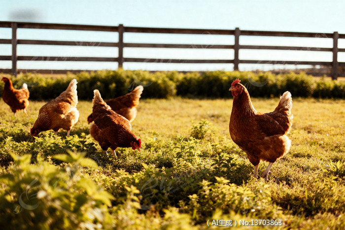 鸡在草地上觅食阳光明媚