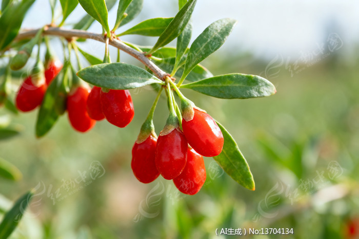 红色枸杞果实挂在绿叶枝条上