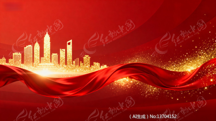 红色绸带与金色城市天际线