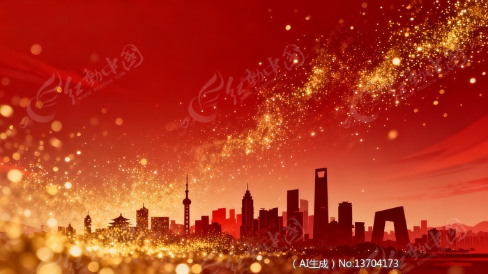 红色背景闪耀金粉的上海城市剪影