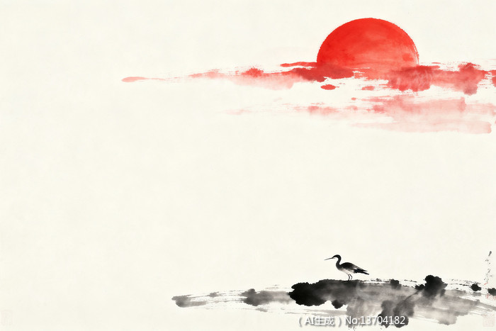 红日白鹤水墨风景