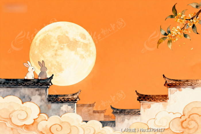 中秋节古建屋顶上的兔子与圆月