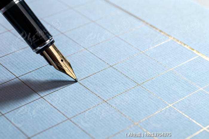 钢笔尖接触蓝色方格纸