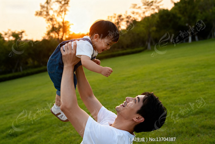 父亲举着孩子在夕阳下的草地上玩耍