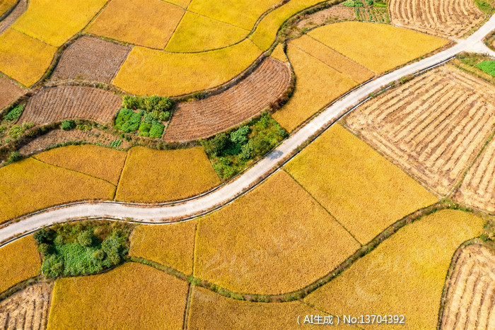 俯瞰视角下的金黄稻田与蜿蜒小路