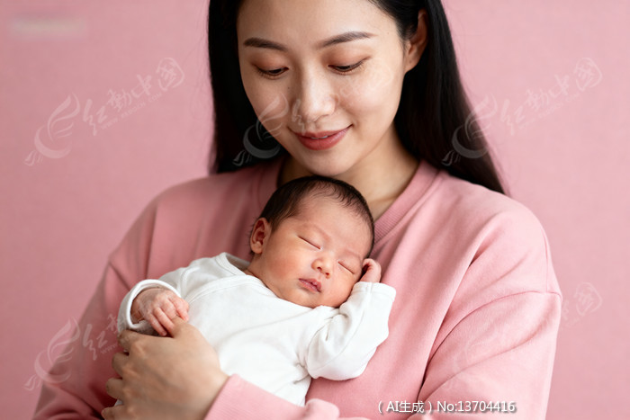 粉色背景下母亲怀抱熟睡的婴儿