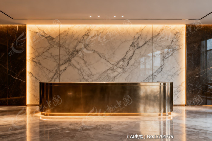 大理石背景墙与金属前台的现代接待区