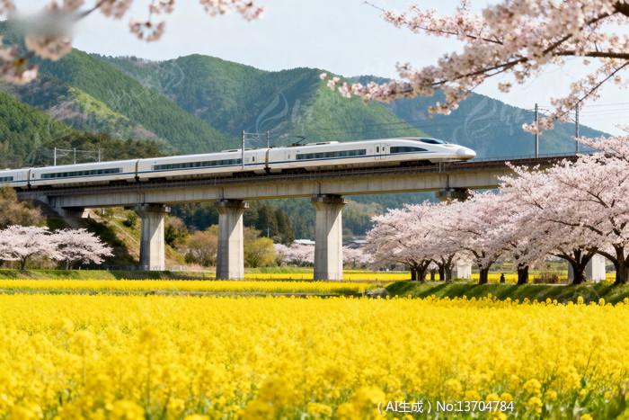 春日田野中穿行的樱花高铁列车
