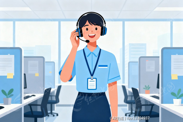 办公室客服人员佩戴耳机微笑示意