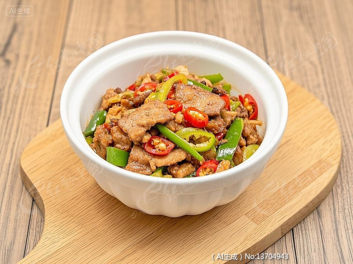 白碗盛青椒红椒炒肉片