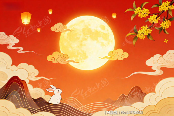 中秋节白兔望月灯笼飘飞红日映照山川