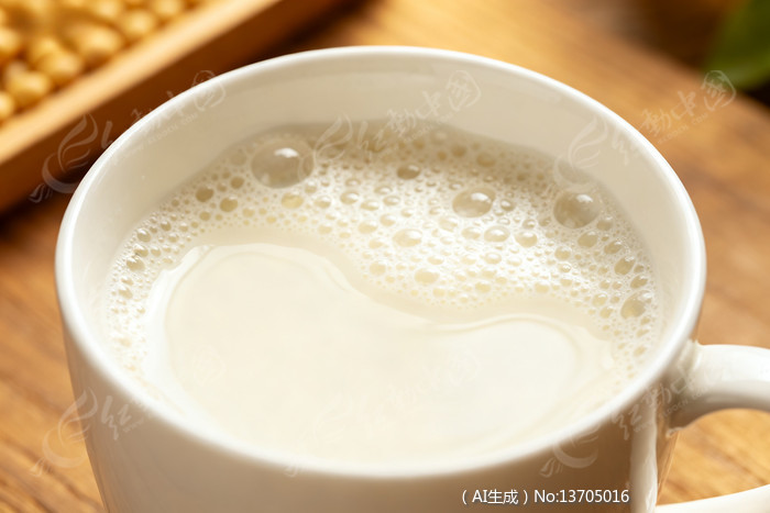 白色杯子里装着冒泡的豆浆