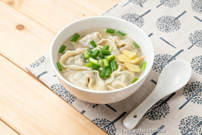 白瓷碗中盛放的馄饨汤点缀葱花和姜片
