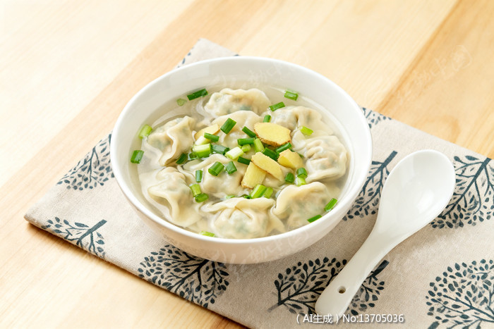 白瓷碗内盛放的清汤水饺撒有葱花和姜片