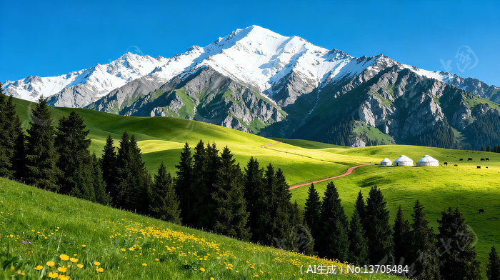 雪山山脚下的草原与松林