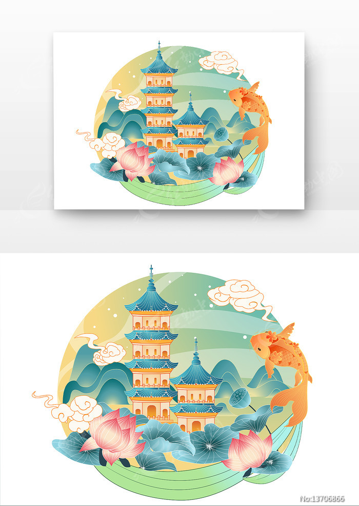 原创古风楼阁锦鲤山水国潮风景插画图片下载_红动中国