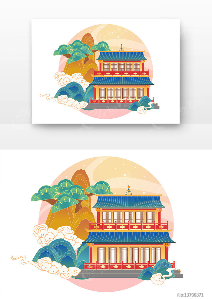 原创中式古风楼阁山水国潮风景插画图片下载_红动中国