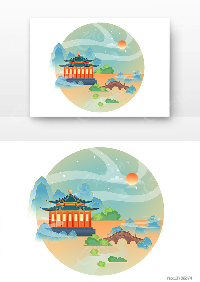 原创中式古风山水亭阁美景国潮风景插画图片下载_红动中国