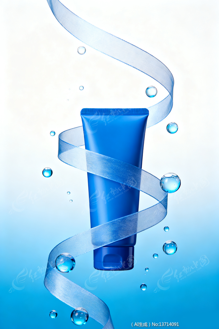 简约风蓝色护肤品化妆品丝带照片背景素材