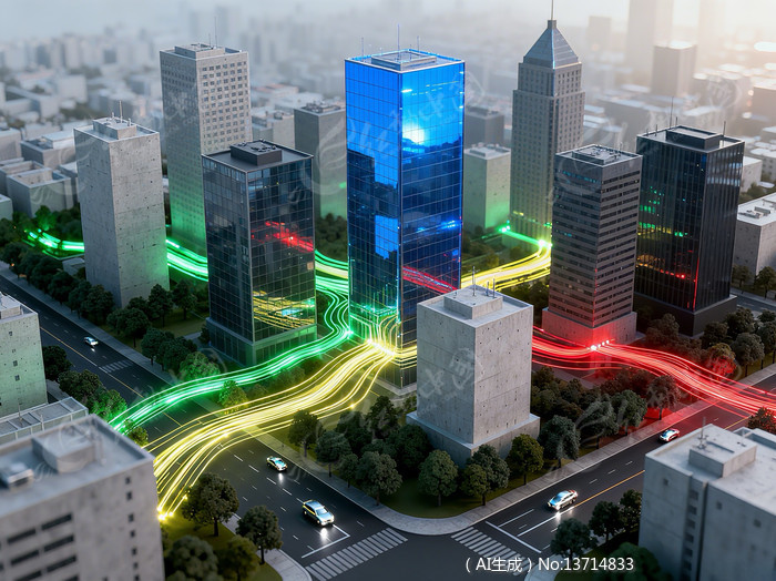 城市楼宇间的光线连接