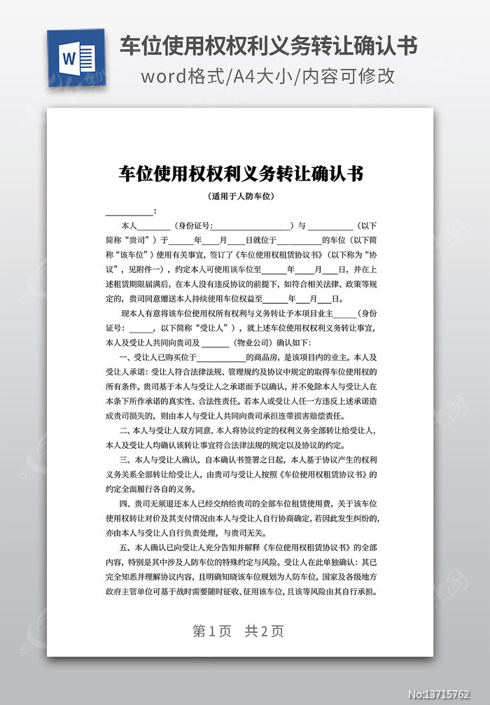 车位使用权权利义务转让确认书下载_红动中国