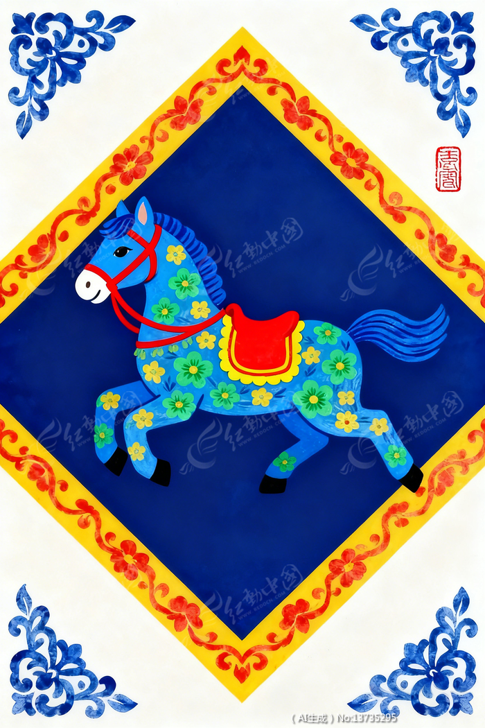 传统风格蓝色小马新年装饰图案艺术插画元素