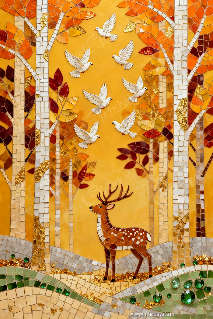 马赛克风格金黄森林小鹿麋鹿白鸽插画装饰画