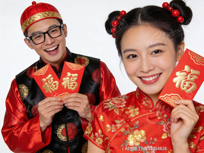 展示春节红包的唐装男女青年
