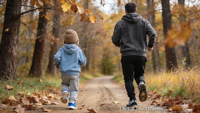 在林间步道上慢跑的父子