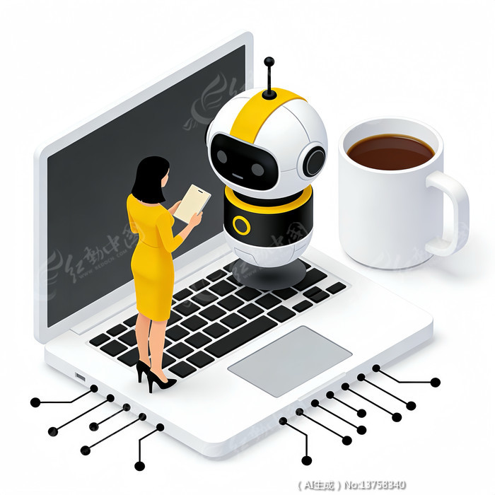 职场女士与机器人沟通主题的插画