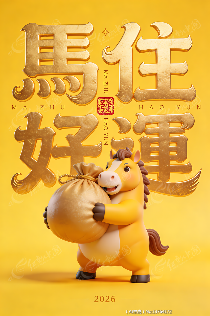 3D渲染春节卡通小马艺术字素材
