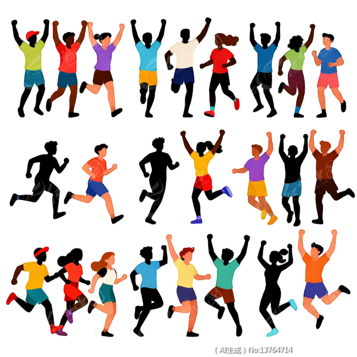卡通风运动员健身者跑步跳跃插画剪影素材