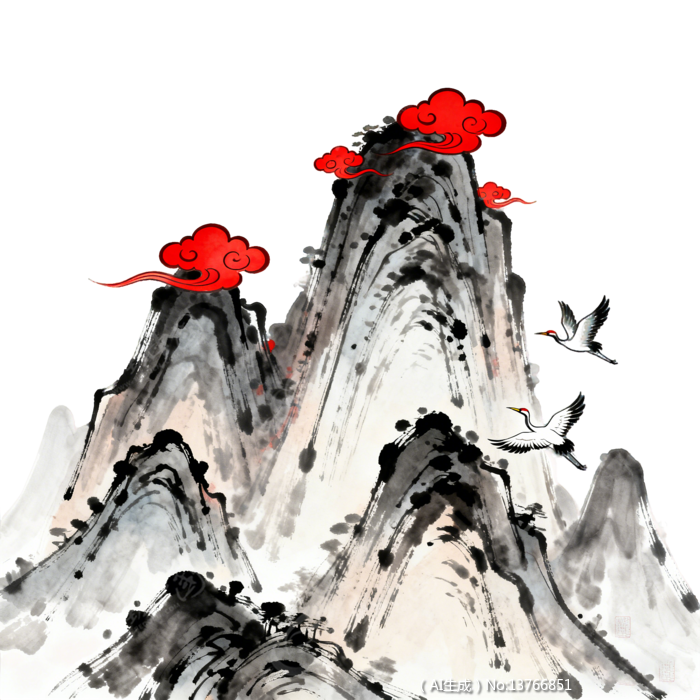 水墨风山水祥云仙鹤插画素材