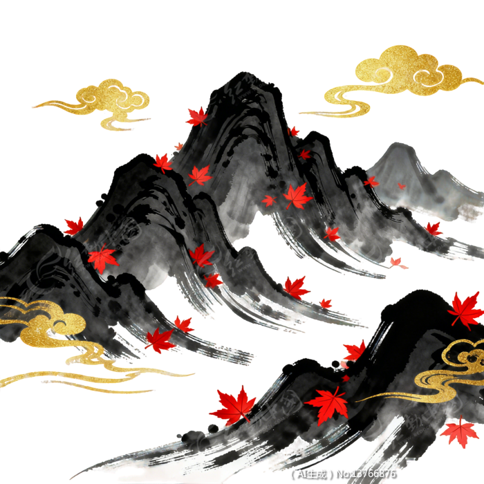 水墨风金箔中国山水枫叶插画素材