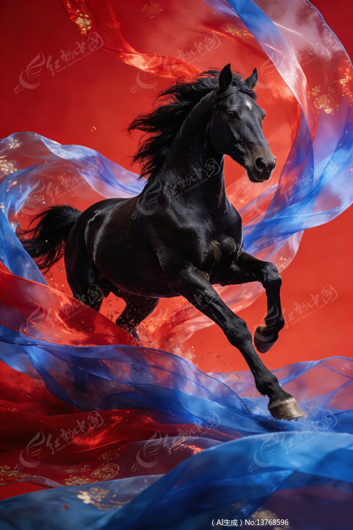 黑色骏马红色背景丝绸元素梦幻写实素材