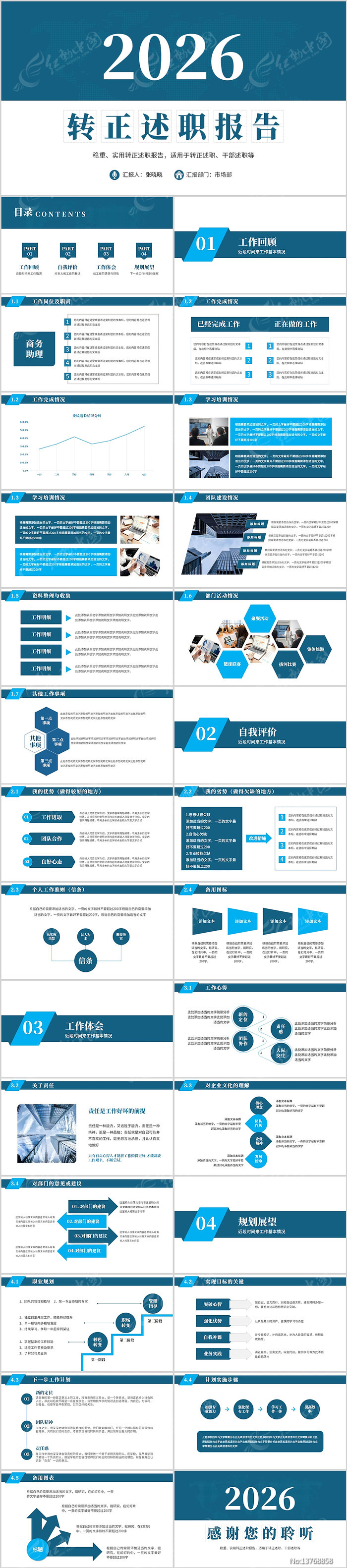 蓝色内容完整转正述职报告PPT下载_红动中国