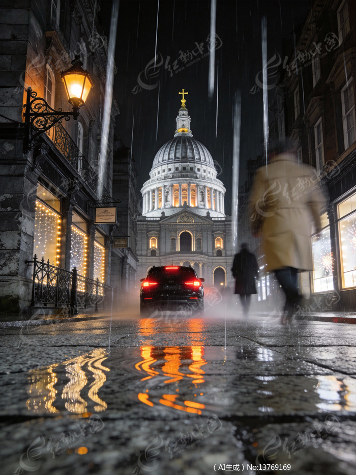 雨夜中的圣保罗古典建筑与行人