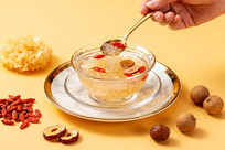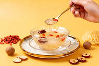 金勺舀银耳汤配红枣枸杞