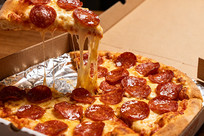 铝盒装的意大利香肠披萨拉丝效果诱人