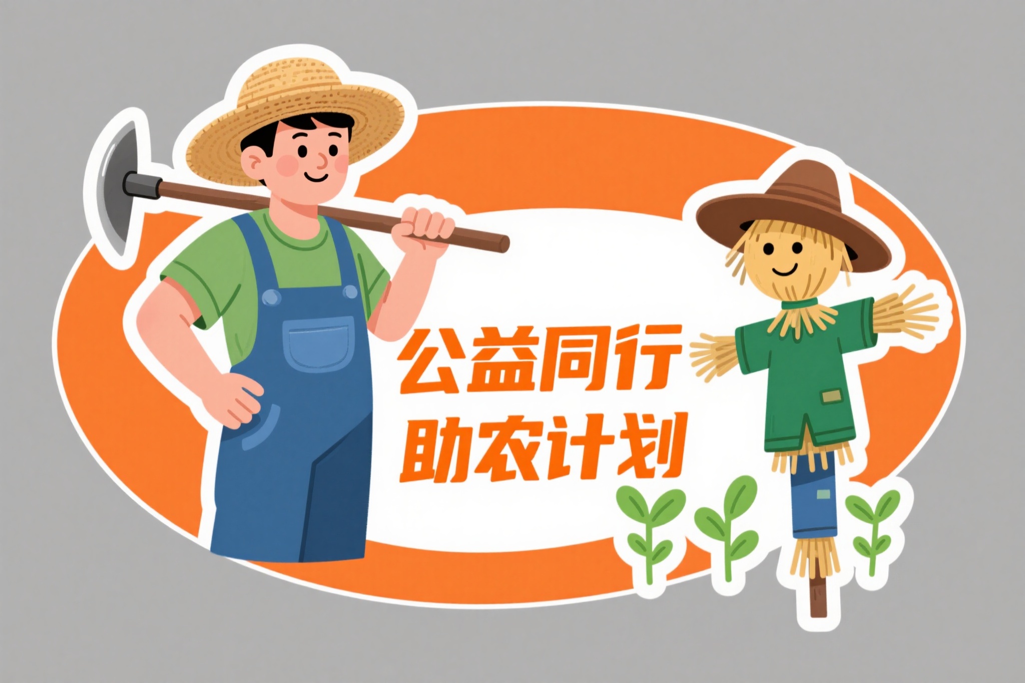 作品描述:公益助农宣传贴画,卡通风格。画面主体为橙色椭圆形背景,左侧是一位戴草帽的男性农民(身穿绿色上衣、蓝色背带裤),右手持锄头扛在肩上,左手叉腰;右侧是一个戴着棕色帽子、穿绿色上衣的稻草人,稻草人双手张开,脚下是绿色幼苗。中间橙色文字 “公益同行 助农计划”,文字采用加粗宋体,整体画面生动,色调以橙、绿、蓝为主,突出公益助农主题。画面背景灰色