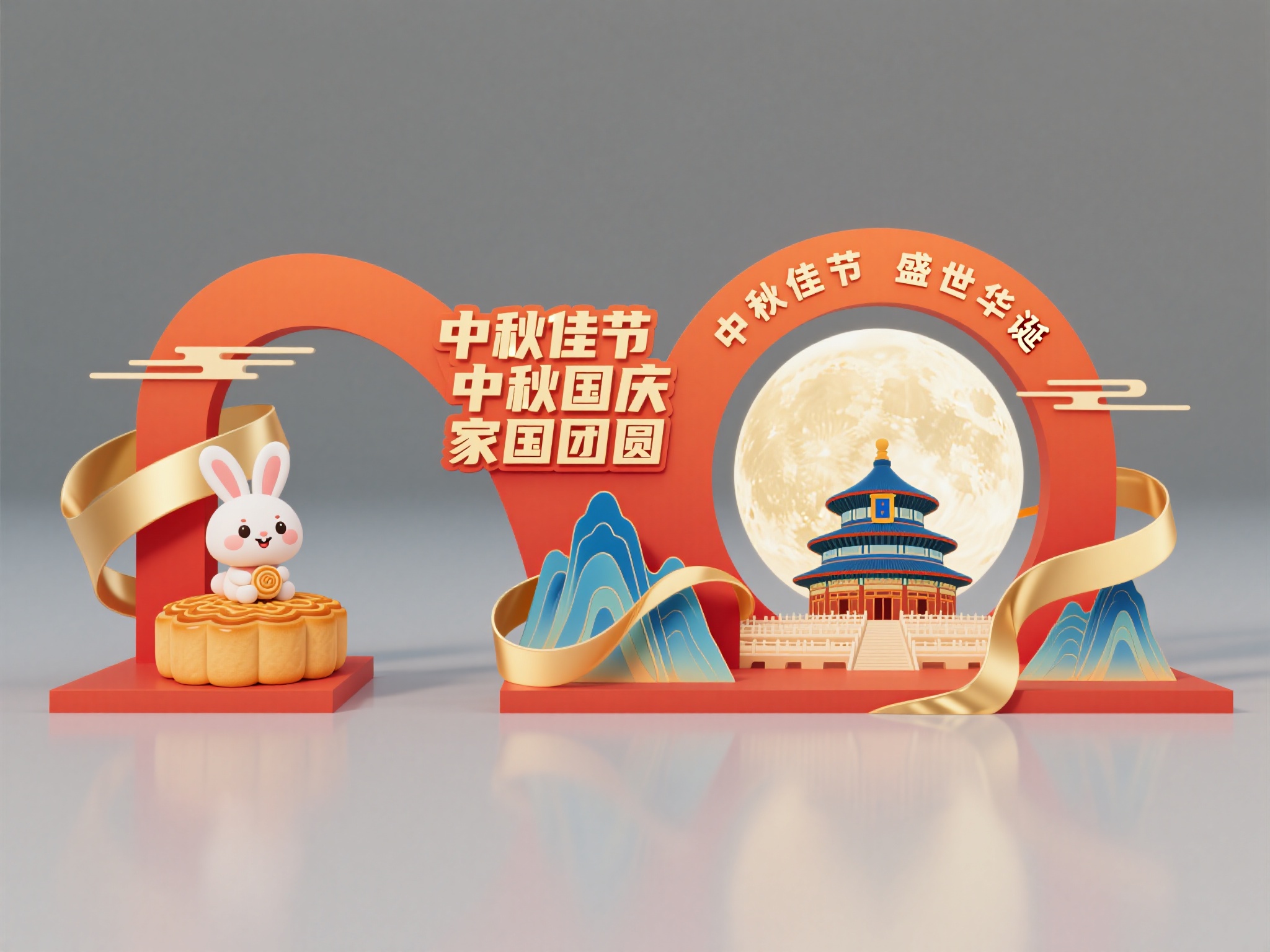 作品描述:中秋国庆双节美陈拱门,主色调红橙,左侧有卡通玉兔坐月饼造型,搭配蓝色山峦、金色飘带,右侧圆形区域呈现圆月与天坛,上方文字“中秋佳节 盛世华诞”“中秋国庆 家国团圆”,整体喜庆且富有传统节日氛围。画面背景灰色