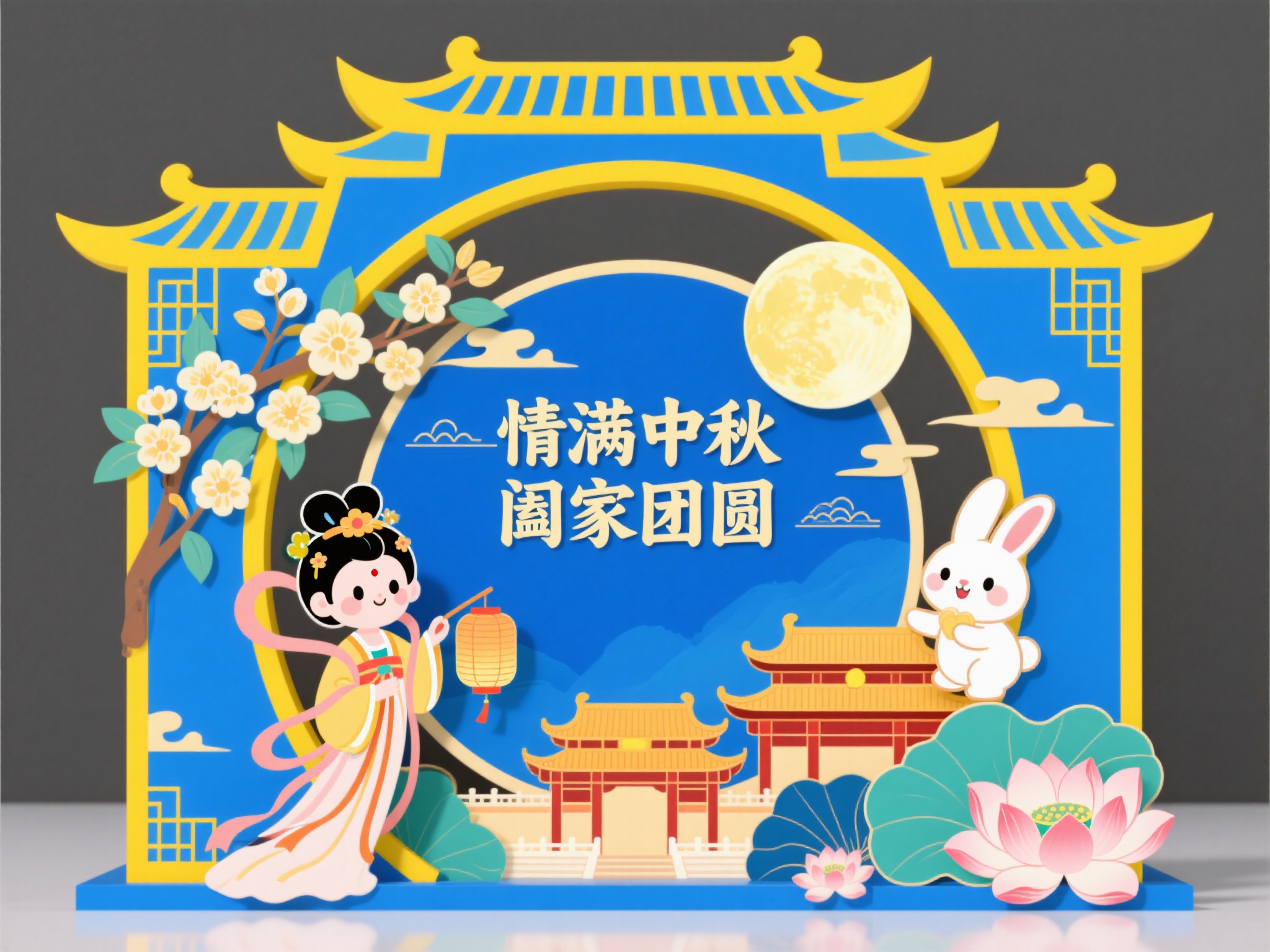 作品描述:情满中秋美陈拱门,蓝黄主色调,包含卡通嫦娥、玉兔(持灯笼),搭配桂花枝、传统宫殿、莲花等元素,中央圆形区域文字 “情满中秋 阖家团圆”,整体富有中式传统韵味与中秋氛围。
