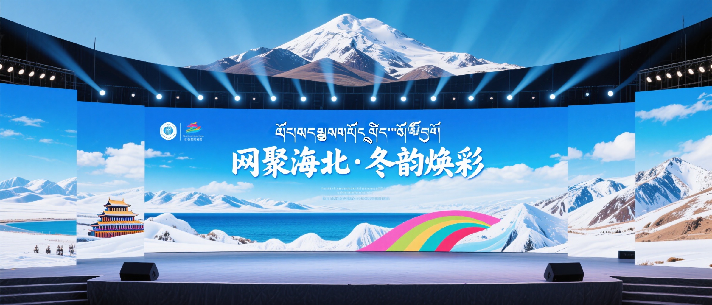 作品描述:“网聚海北·冬韵焕彩”突出海北藏族自治州旅游以“网聚海北·冬韵焕彩”为主题,突出同宝山,岗什卡雪峰,青海湖,设计开幕式背景,蓝天少一点,换一组,再换一组不要舞台效果,把侧背景和主背景合成一张图
