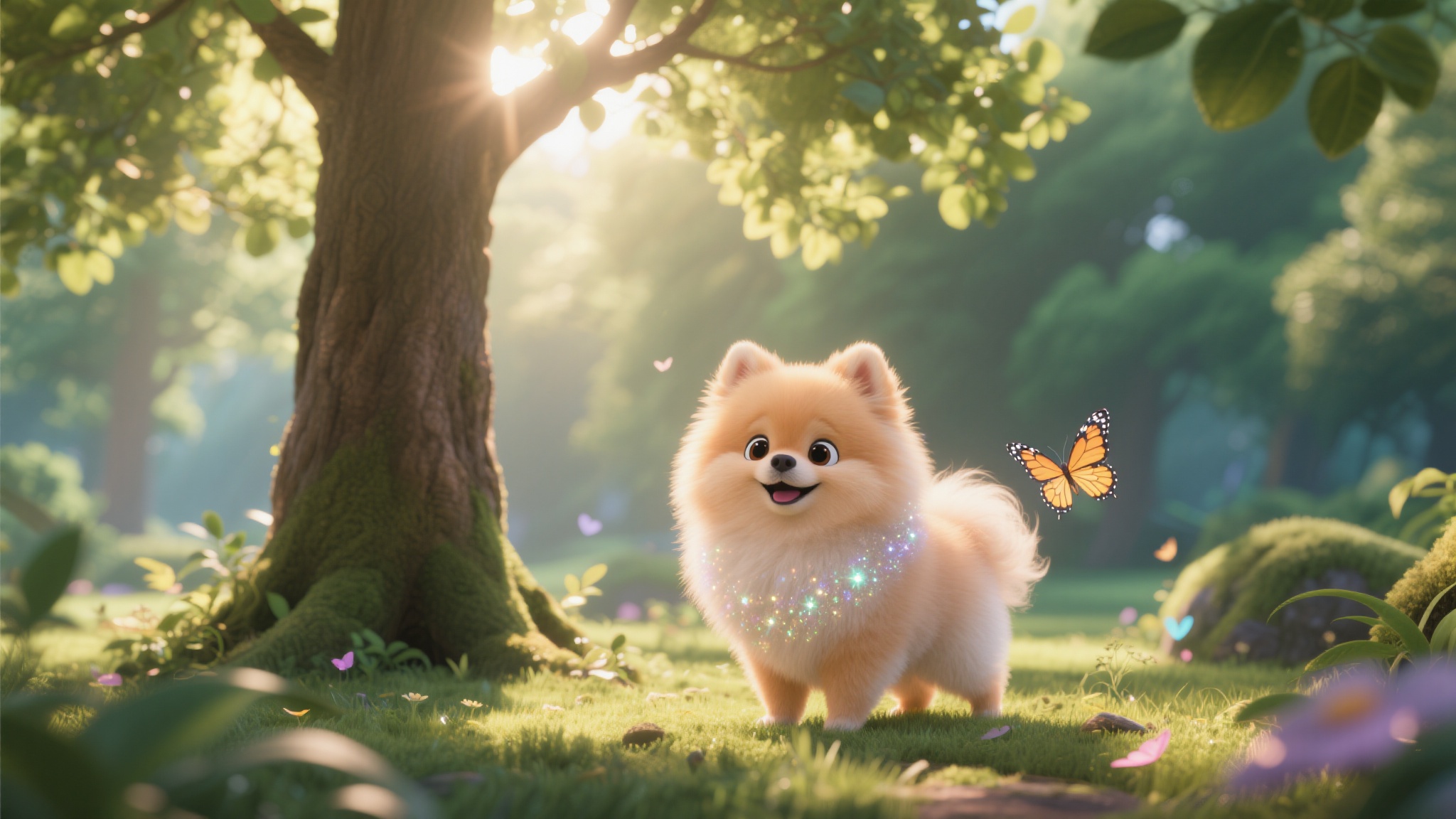 作品描述:在大自然中,迪斯尼动画的感觉,万物皆有灵,生成博美犬的唯美图片,旁边有闪闪的小蝴蝶,有一棵比直的大树的,阳光从树叶中透过。3D效果