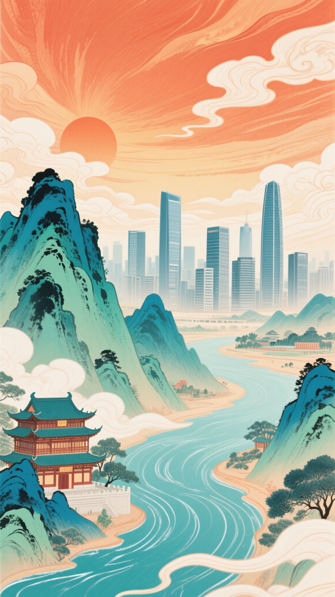 作品描述:国风写意插画,山水间的现代都市,山峦以蓝绿色泼墨感呈现,现代高楼与中式古建相互映衬,河流如丝带蜿蜒,天空铺展橙红霞光、祥云飘逸,营造大气诗意画面。
